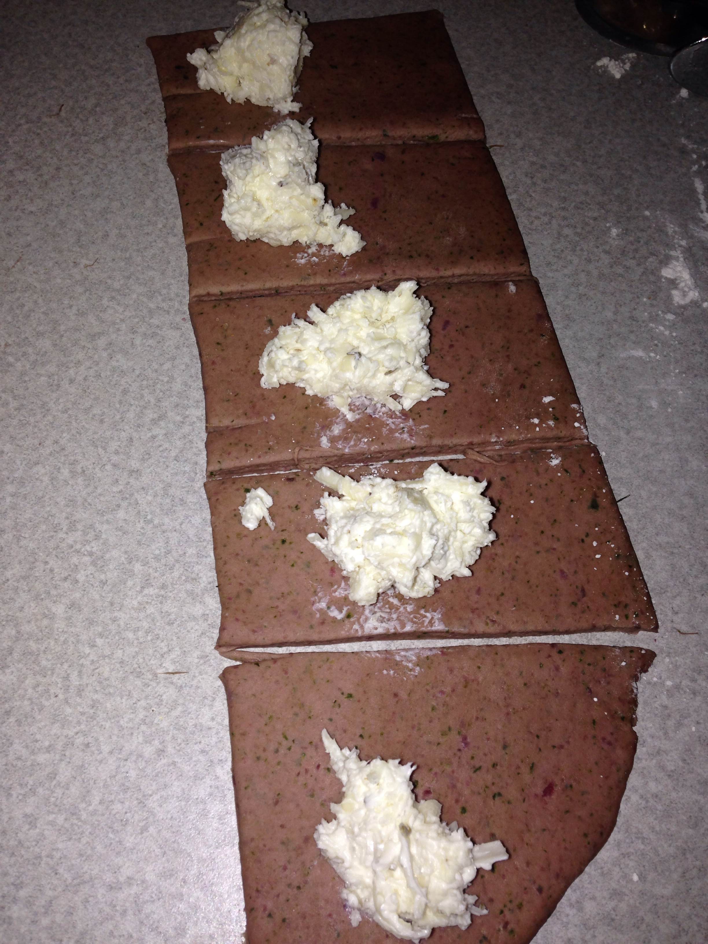 - Drop teaspoonfuls of filling into the strips about an inch apart, then slice between drops (image B).